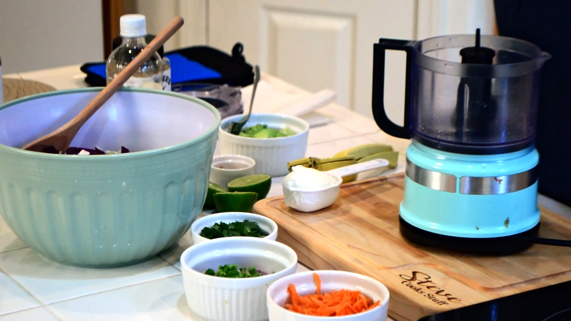 - Slowly pour the avocado crema into the coleslaw mixture, adding a little at a time while gently tossing. Continue until everything is evenly coated.